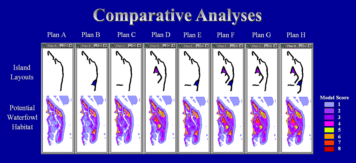The dabbling duck models were conceived in a workshop that brought together land managers, engineers, and biologists. The spatial models helped evaluate island configurations for a habitat restoration project on the Upper Mississippi River.