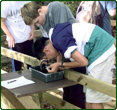Online panoramic views: Fall 2004 An "outdoor classroom" has been constructed on Center grounds in a floodplain area of the Black River. A handicap-accessible walkway for students and teachers to walk through the floodplain forest and out over the water of the backwater slough to an observation platform has been built. Students from elementary school age through college have the opportunity to study a floodplain forest and a river back water habitat by viewing educational posters, displays of the animals and plants present, or actively taking water, plant or sediment samples to study.