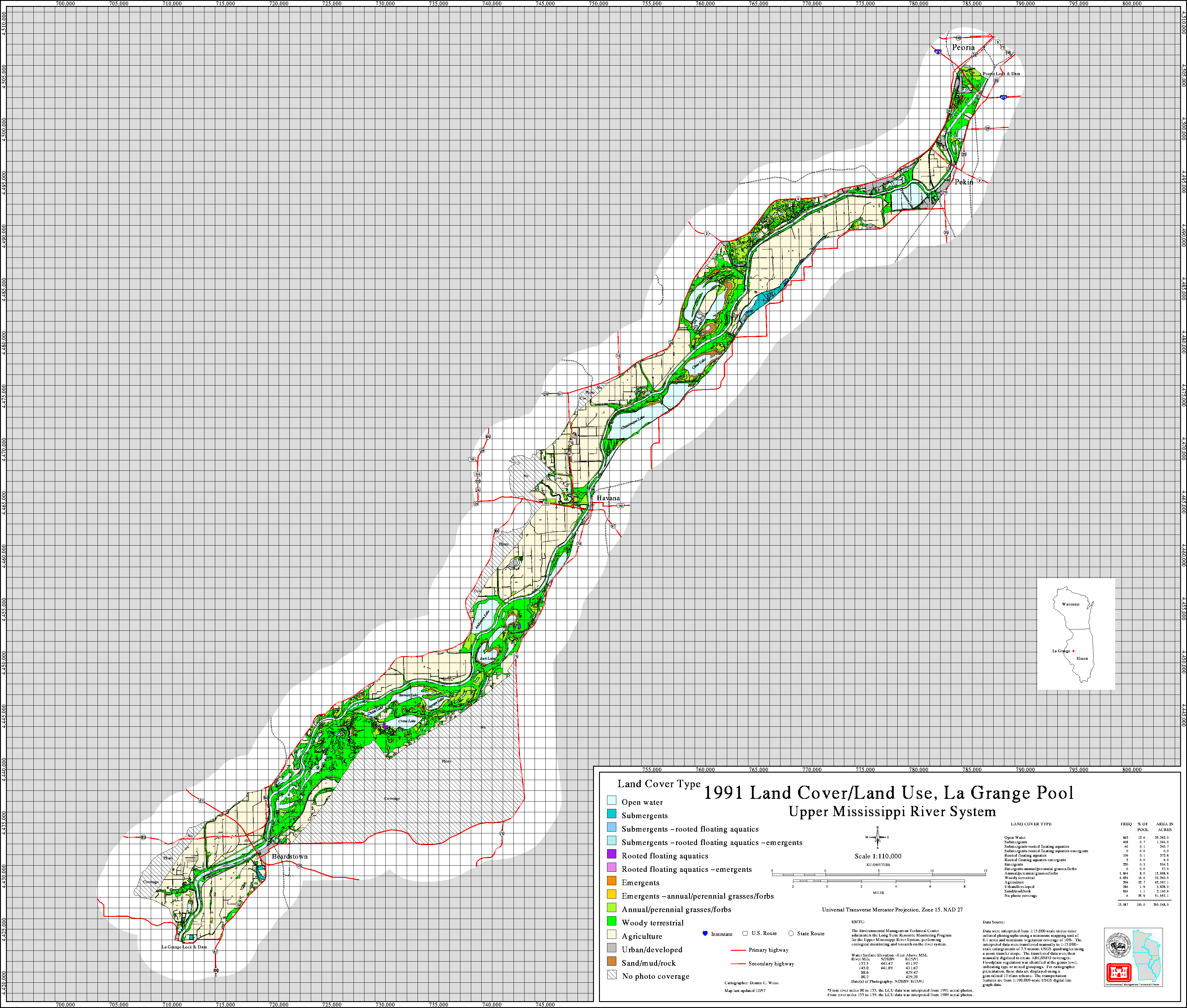 Since 1989 the Upper Midwest Environmental Center through its association with the Long Term Resource Monitoring Program has been creating land cover/use data sets for the Upper Mississippi River system. For background information on how these data sets were created and are attributed, activate the help buttons. A link to a freeware GIS data viewer that can read the Shape files is also available.