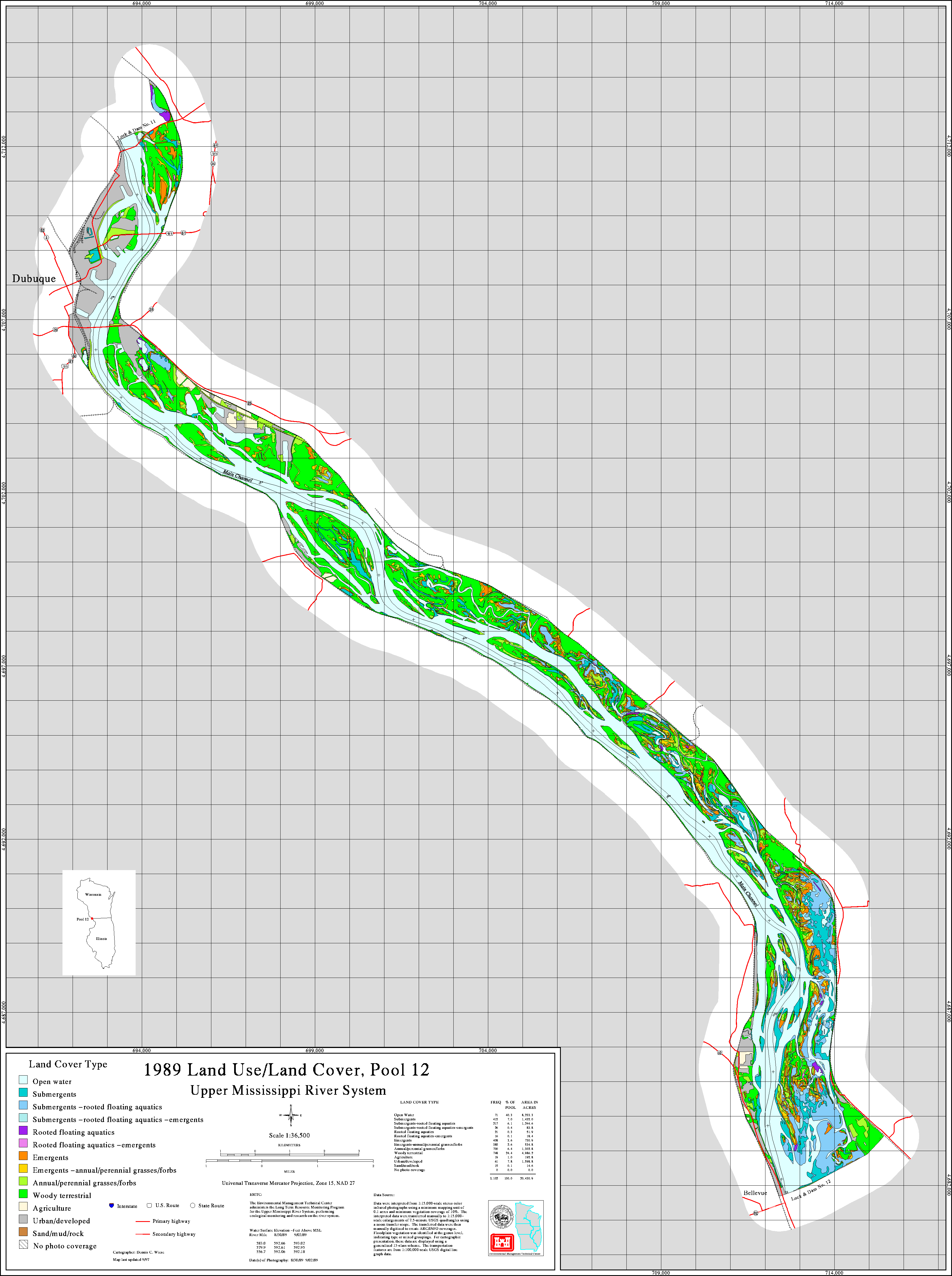 Since 1989 the Upper Midwest Environmental Center through its association with the Long Term Resource Monitoring Program has been creating land cover/use data sets for the Upper Mississippi River system. For background information on how these data sets were created and are attributed, activate the help buttons. A link to a freeware GIS data viewer that can read the Shape files is also available.
