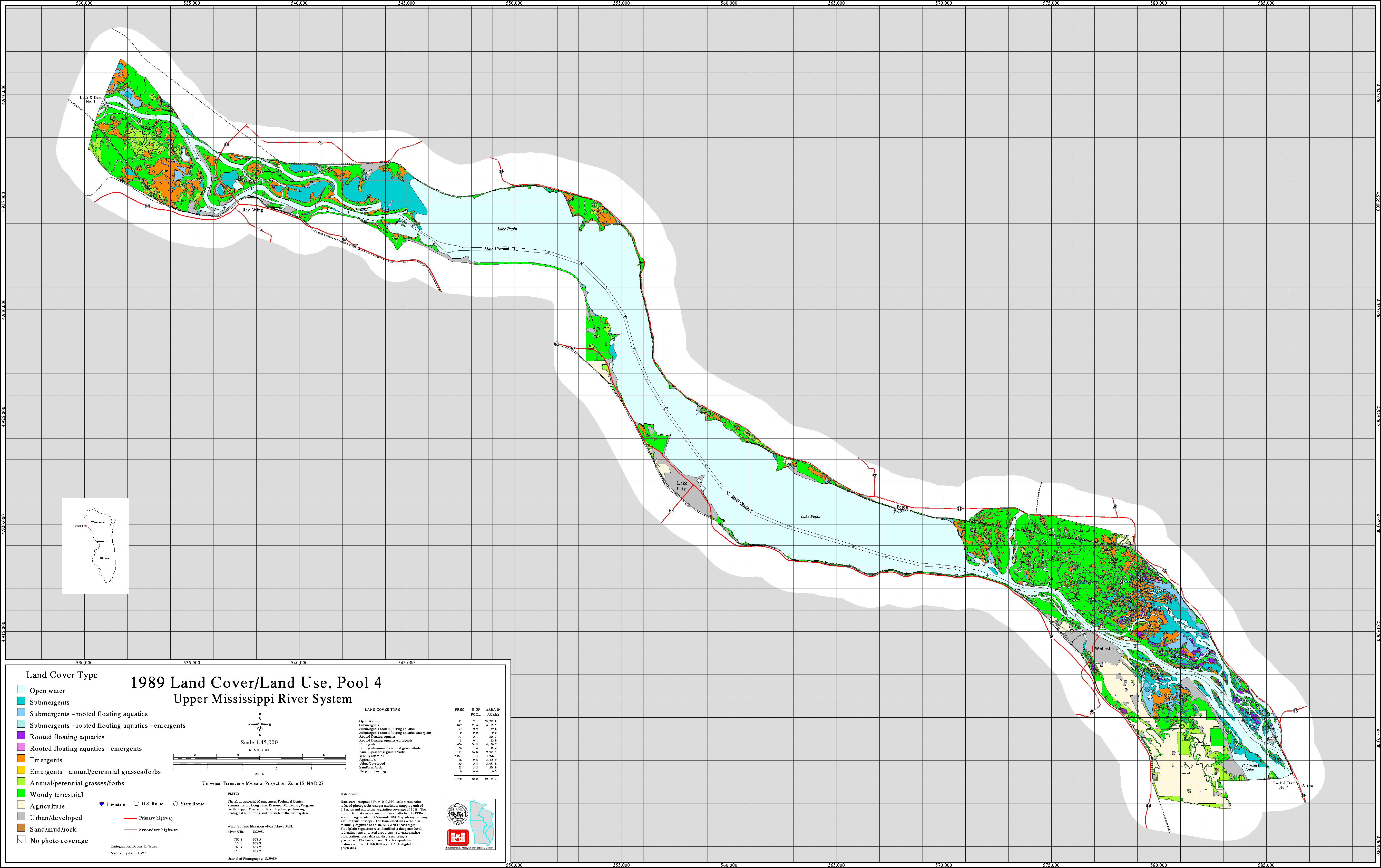 Since 1989 the Upper Midwest Environmental Center through its association with the Long Term Resource Monitoring Program has been creating land cover/use data sets for the Upper Mississippi River system. For background information on how these data sets were created and are attributed, activate the help buttons. A link to a freeware GIS data viewer that can read the Shape files is also available on the file format/data transfer information page.
