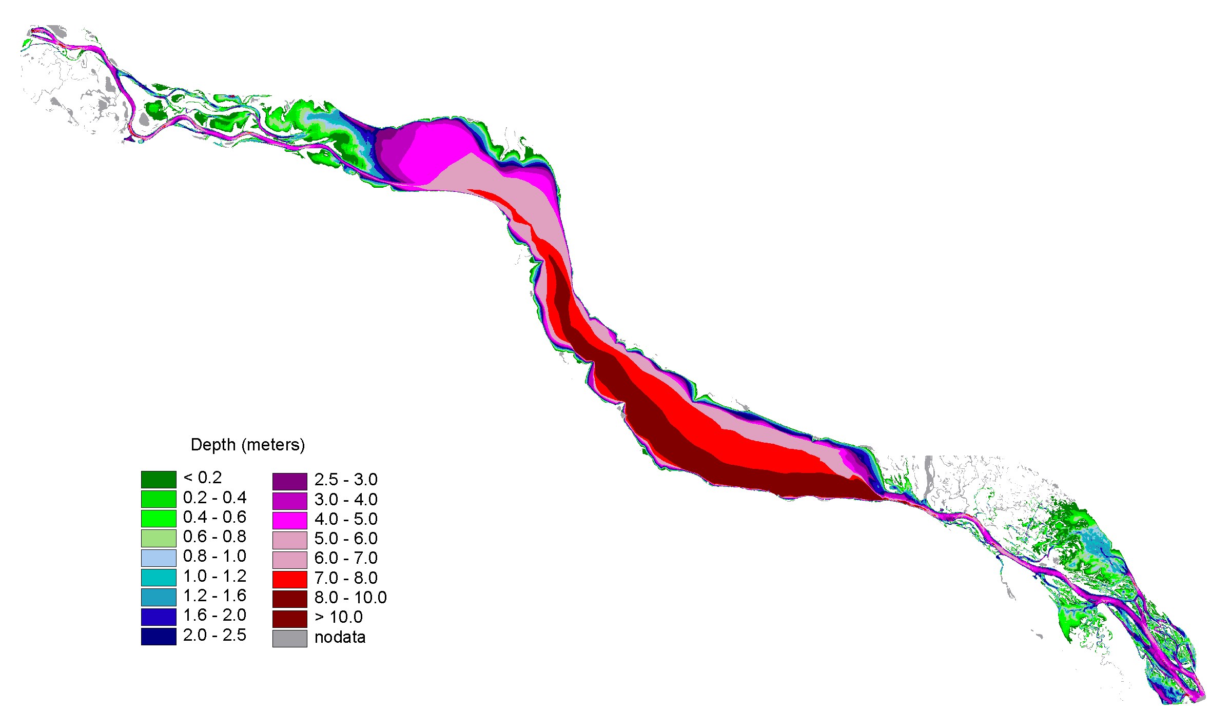 The Center collects bathymetric (i.e., water depth) data in selected portions of the Mississippi River. The data are provided here as high resolution raster data in ArcInfo Grid format, or a simplified shape file with ranges of depth (e.g., depth between 4 and 6 meters are lumped together). Information on how to access these data are available through the help button, and information on how these data are collected and processed are contained in the help pages.
