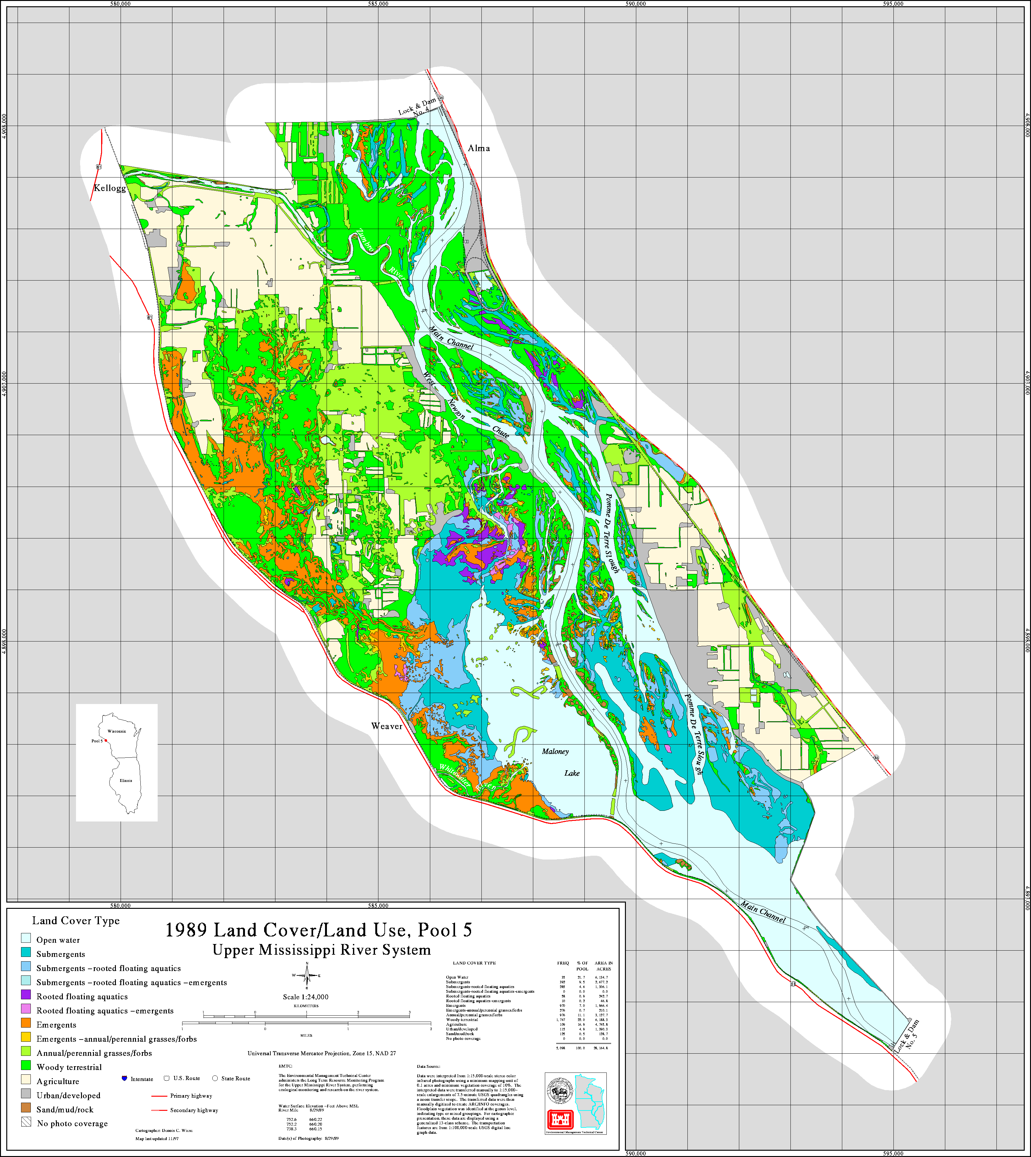 Since 1989 the Upper Midwest Environmental Center through its association with the Long Term Resource Monitoring Program has been creating land cover/use data sets for the Upper Mississippi River system. For background information on how these data sets were created and are attributed, activate the help buttons. A link to a freeware GIS data viewer that can read the Shape files is also available on the file format/data transfer information page.