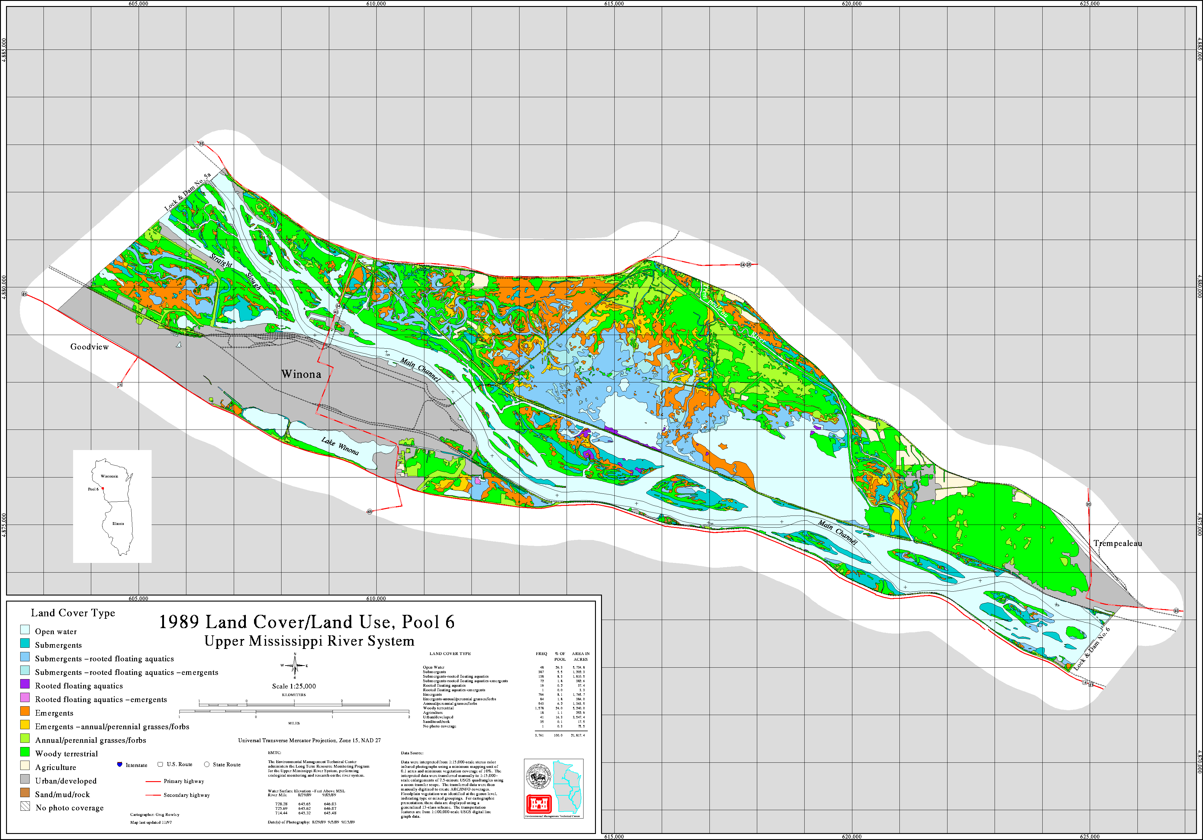 Since 1989 the Upper Midwest Environmental Center through its association with the Long Term Resource Monitoring Program has been creating land cover/use data sets for the Upper Mississippi River system. For background information on how these data sets were created and are attributed, activate the help buttons. A link to a freeware GIS data viewer that can read the Shape files is also available on the file format/data transfer information page.