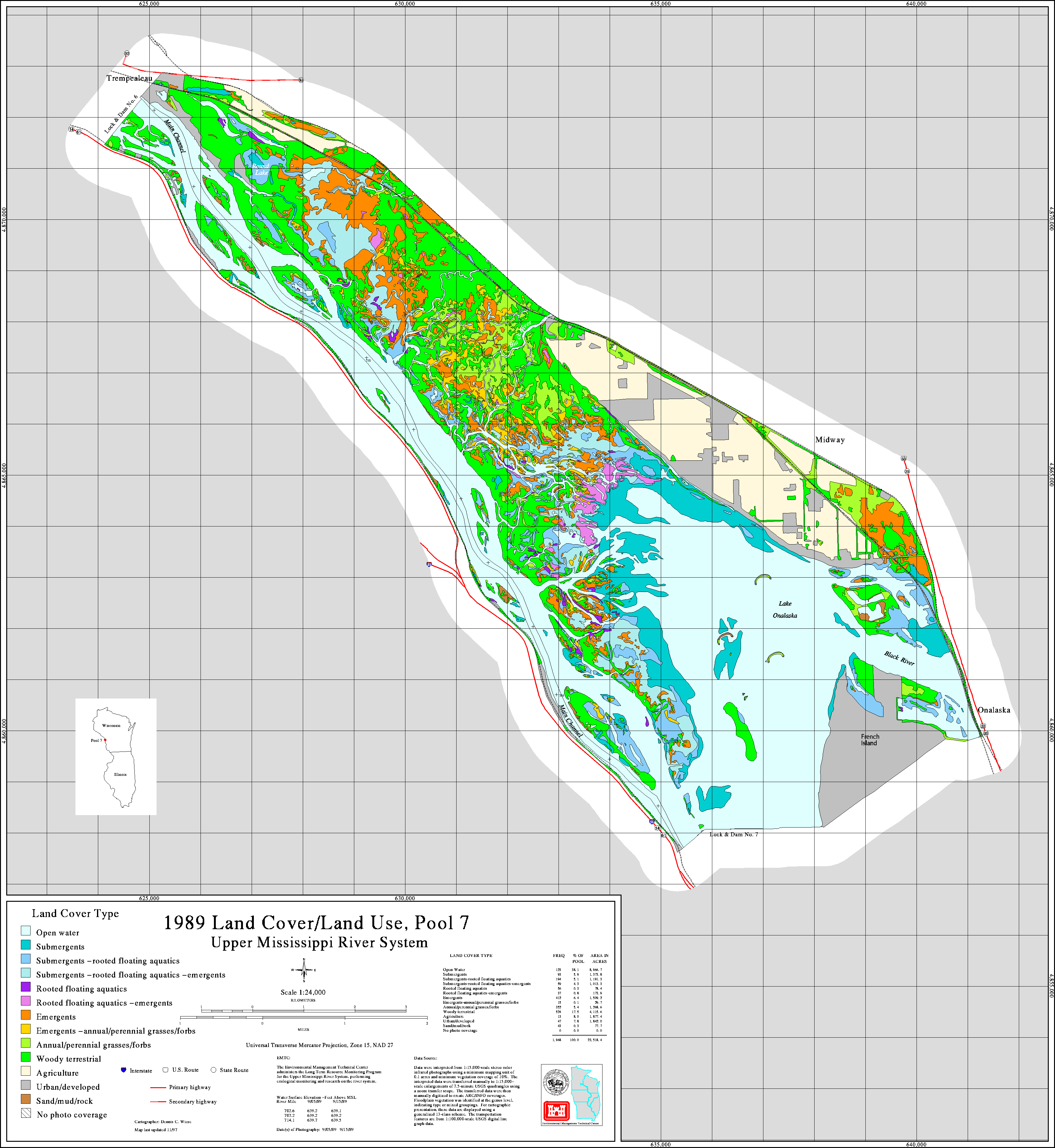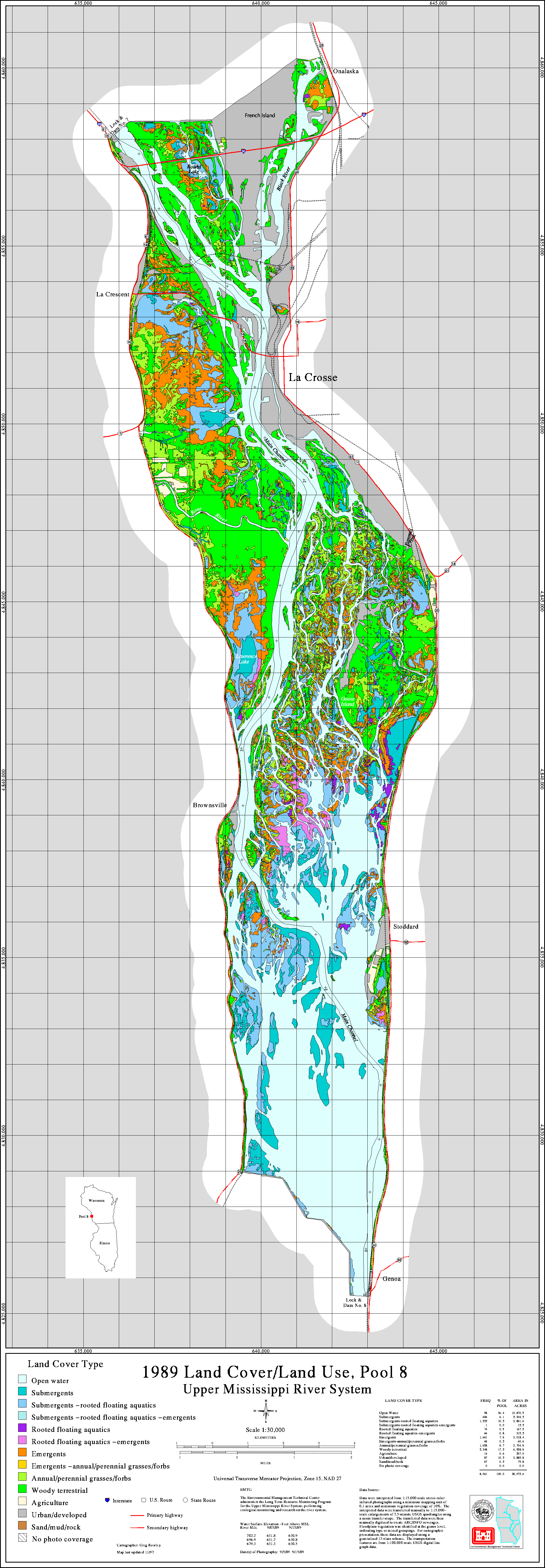 Since 1989 the Upper Midwest Environmental Center through its association with the Long Term Resource Monitoring Program has been creating land cover/use data sets for the Upper Mississippi River system. For background information on how these data sets were created and are attributed, activate the help buttons. A link to a freeware GIS data viewer that can read the Shape files is also available.