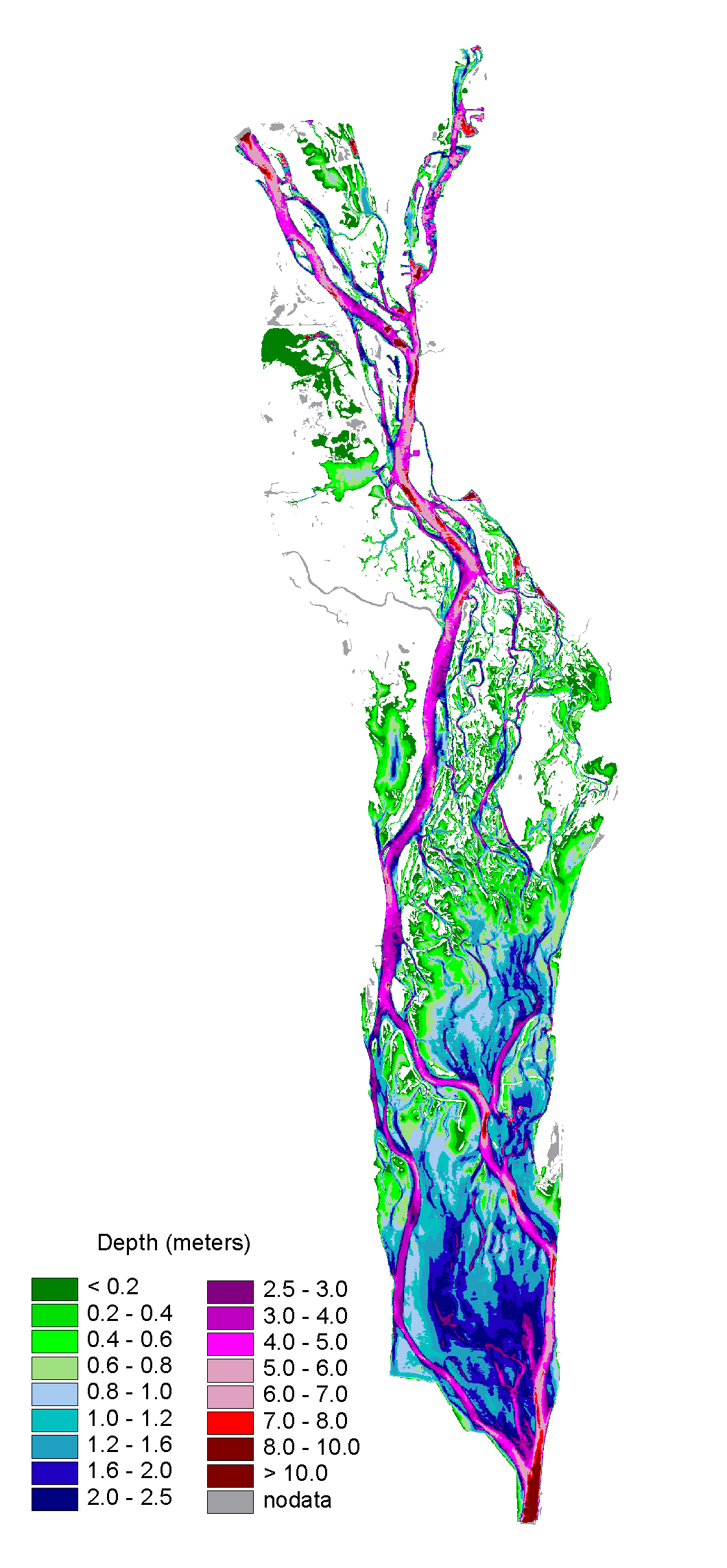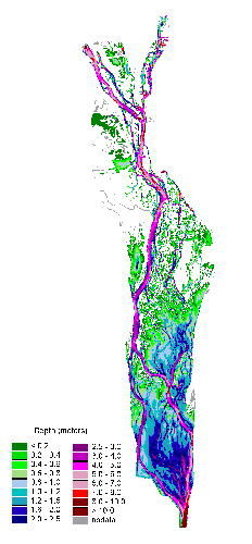 The Center collects bathymetric (i.e., water depth) data in selected portions of the Mississippi River. The data are provided here as high resolution raster data in ArcInfo Grid format, or a simplified shape file with ranges of depth (e.g., depth between 4 and 6 meters are lumped together). Information on how to access these data are available through the help button, and information on how these data are collected and processed are contained in the help pages.