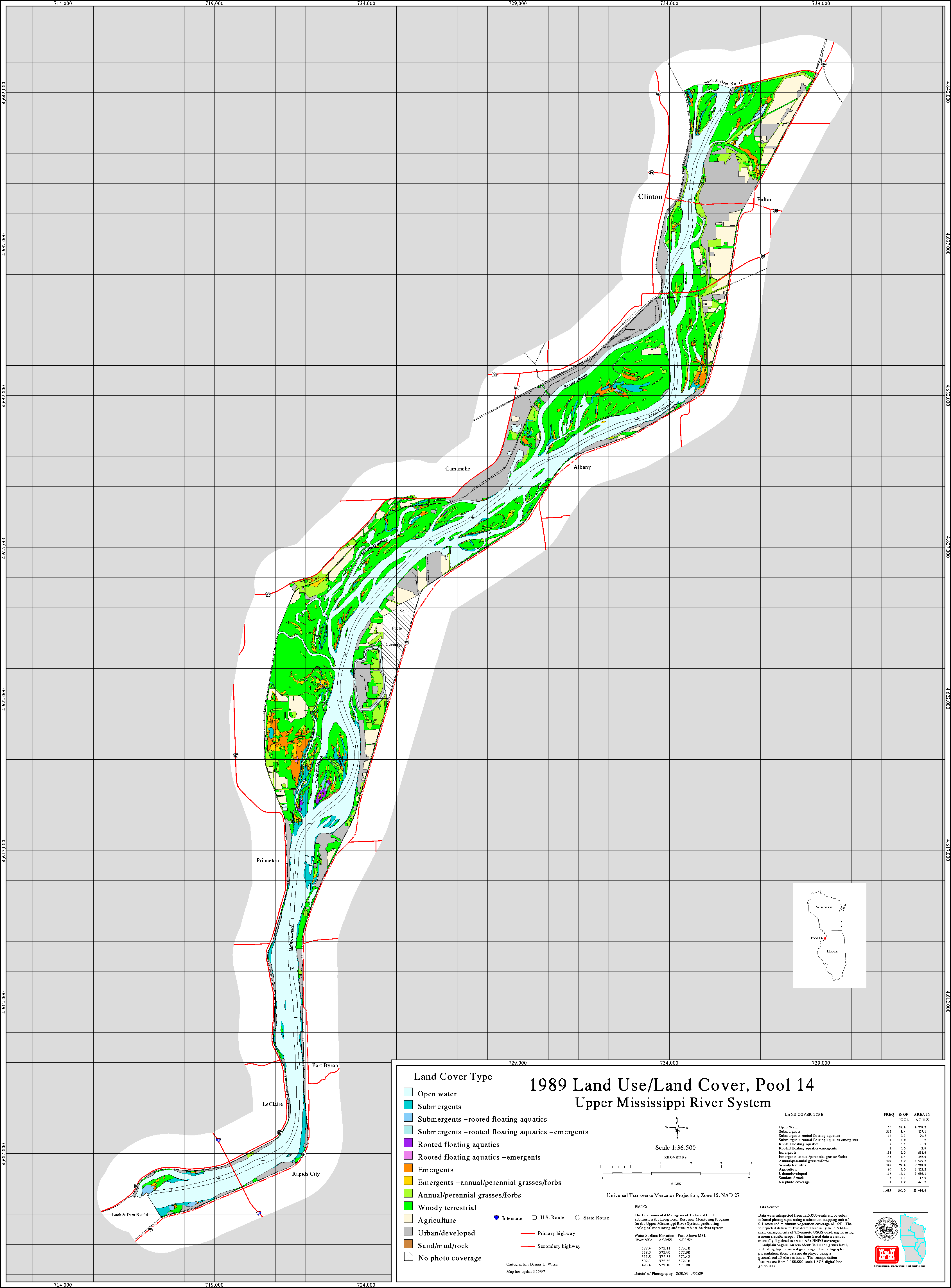 Since 1989 the Upper Midwest Environmental Center through its association with the Long Term Resource Monitoring Program has been creating land cover/use data sets for the Upper Mississippi River system. For background information on how these data sets were created and are attributed, activate the help buttons. A link to a freeware GIS data viewer that can read the Shape files is also available.
