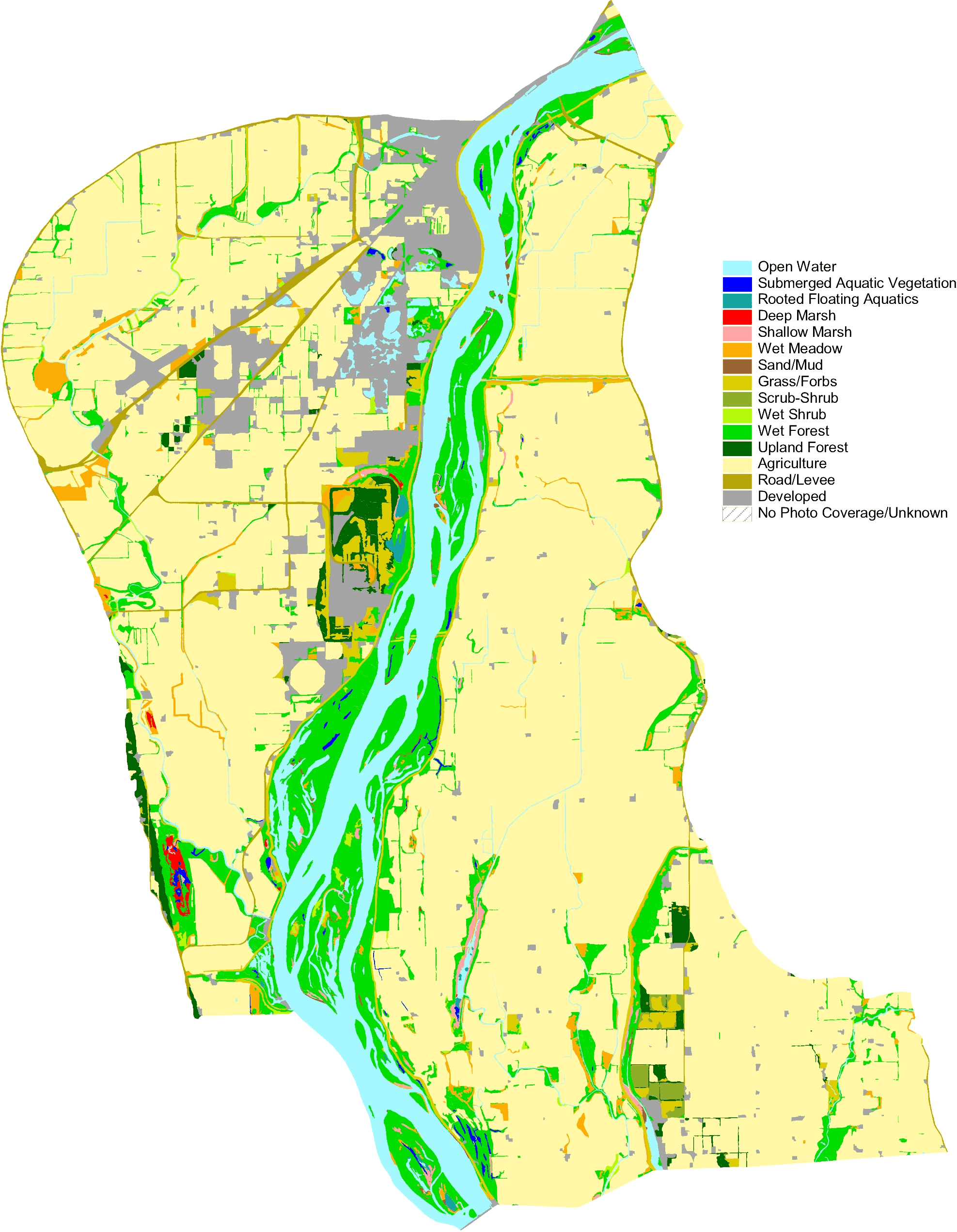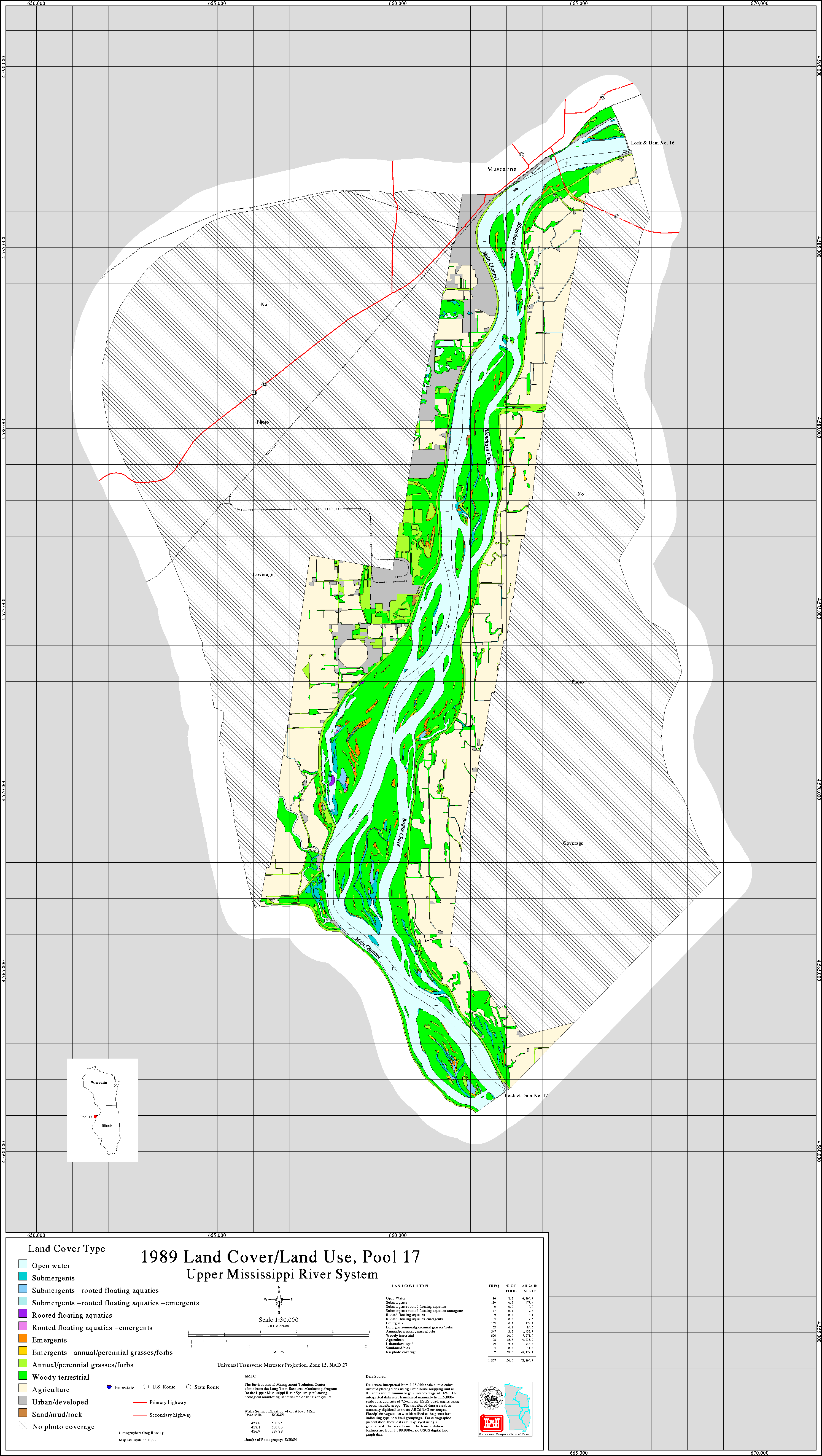 Since 1989 the Upper Midwest Environmental Center through its association with the Long Term Resource Monitoring Program has been creating land cover/use data sets for the Upper Mississippi River system. For background information on how these data sets were created and are attributed, activate the help buttons. A link to a freeware GIS data viewer that can read the Shape files is also available.
