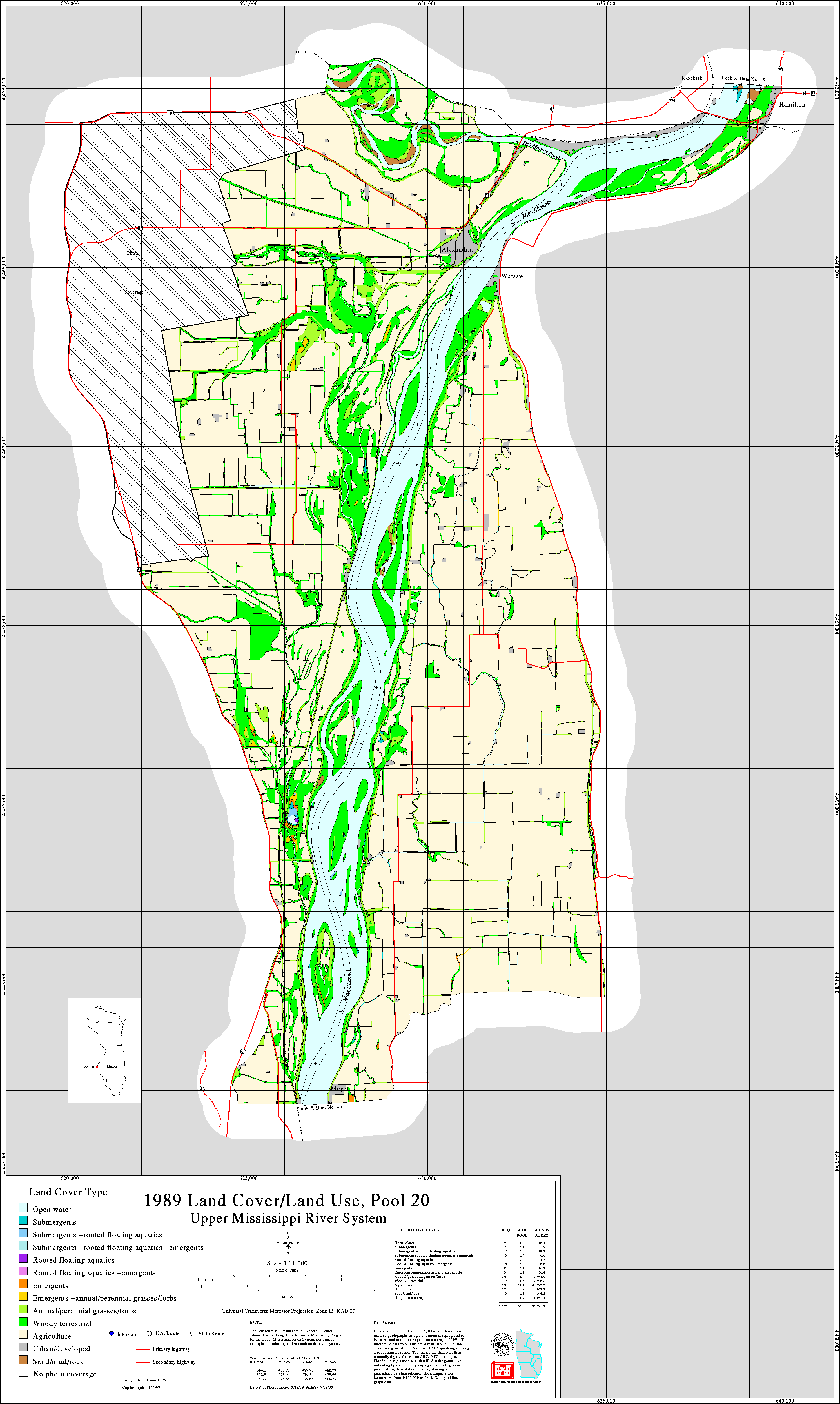 Since 1989 the Upper Midwest Environmental Center through its association with the Long Term Resource Monitoring Program has been creating land cover/use data sets for the Upper Mississippi River system. For background information on how these data sets were created and are attributed, activate the help buttons. A link to a freeware GIS data viewer that can read the Shape files is also available.
