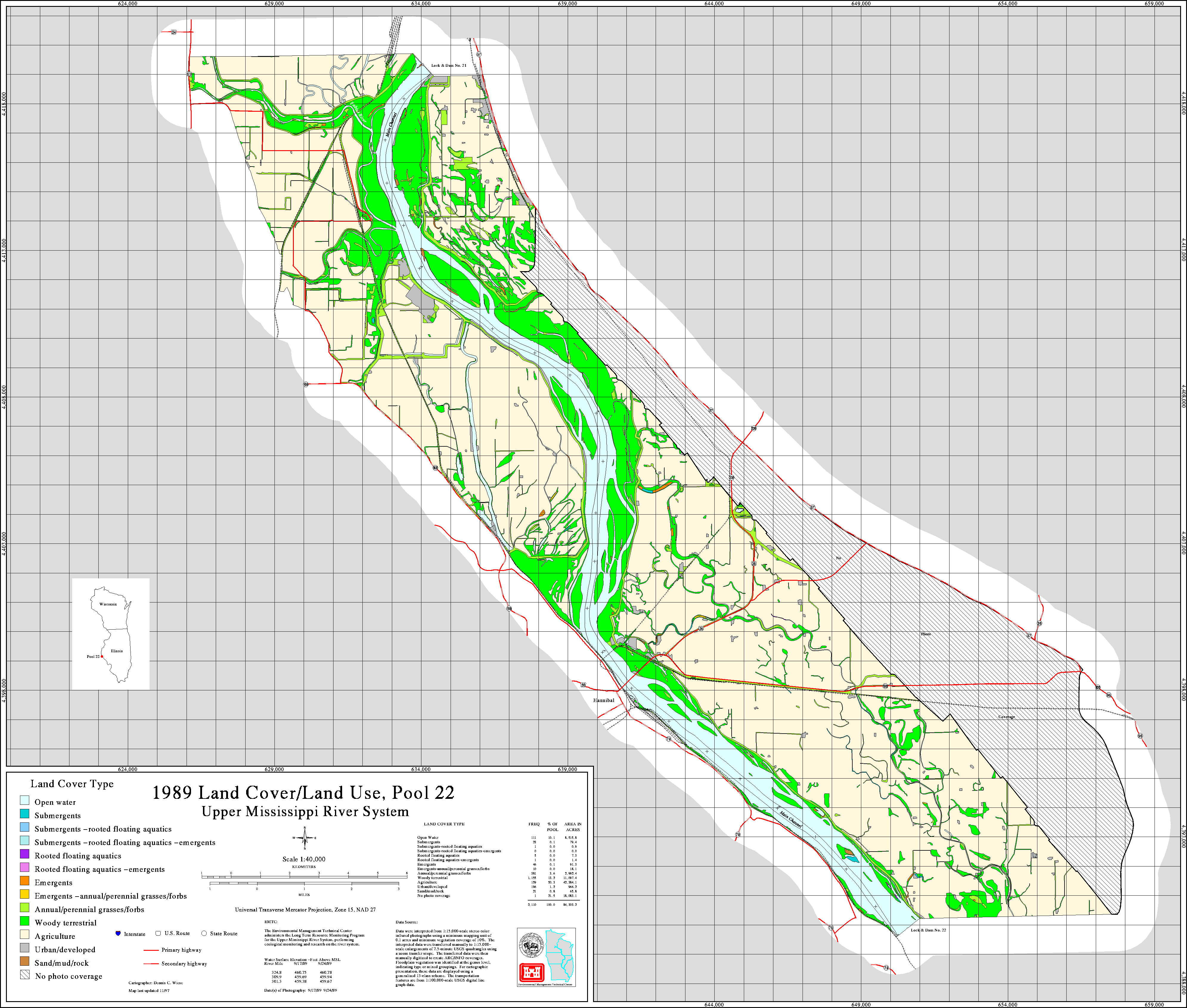 Since 1989 the Upper Midwest Environmental Center through its association with the Long Term Resource Monitoring Program has been creating land cover/use data sets for the Upper Mississippi River system. For background information on how these data sets were created and are attributed, activate the help buttons. A link to a freeware GIS data viewer that can read the Shape files is also available.