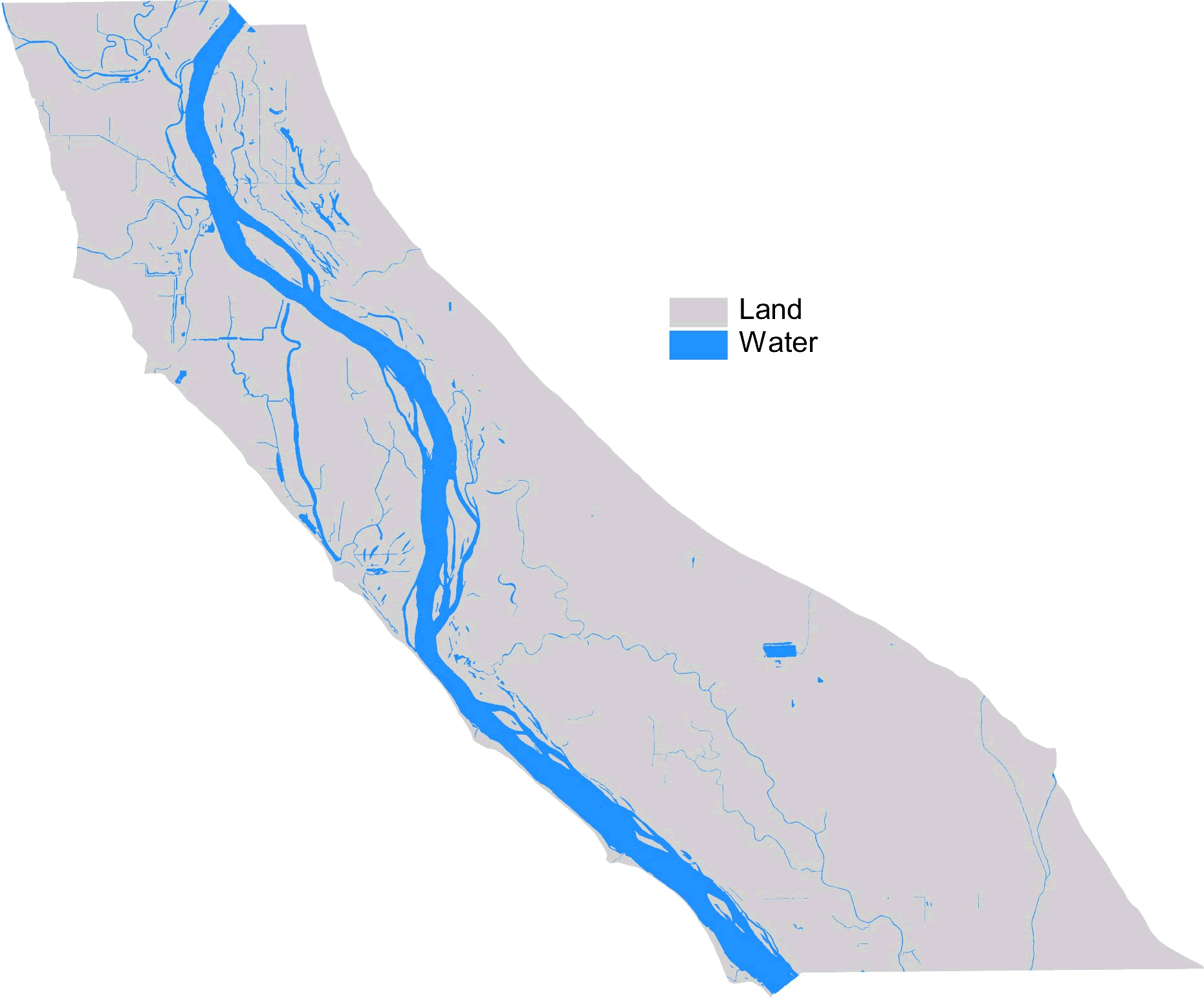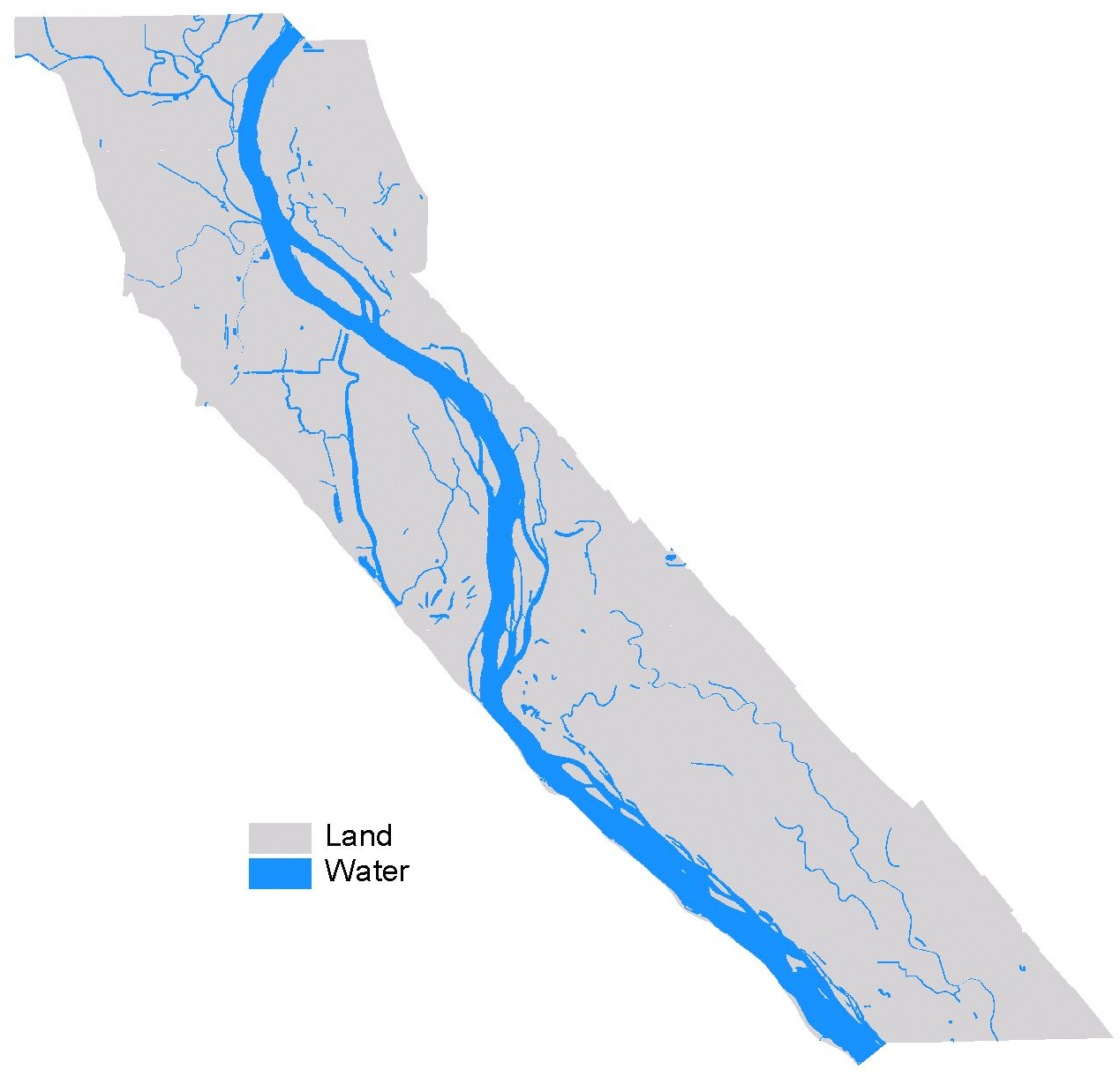 Land/water is one of the classification attributes in the land cover/use data sets created by UMESC from aerial photography. These data are redistributed here as shape files with the boundaries of the region's 1:24,000-scale USGS quadrangles added to the data. This has been done because individuals working with ArcView have reported numerous problems if they attempt to perform a dissolve on the land cover/use data to create a land/water only shape file. Most printers cannot process the detailed land/water boundaries unless some form of a break line or lines are added.