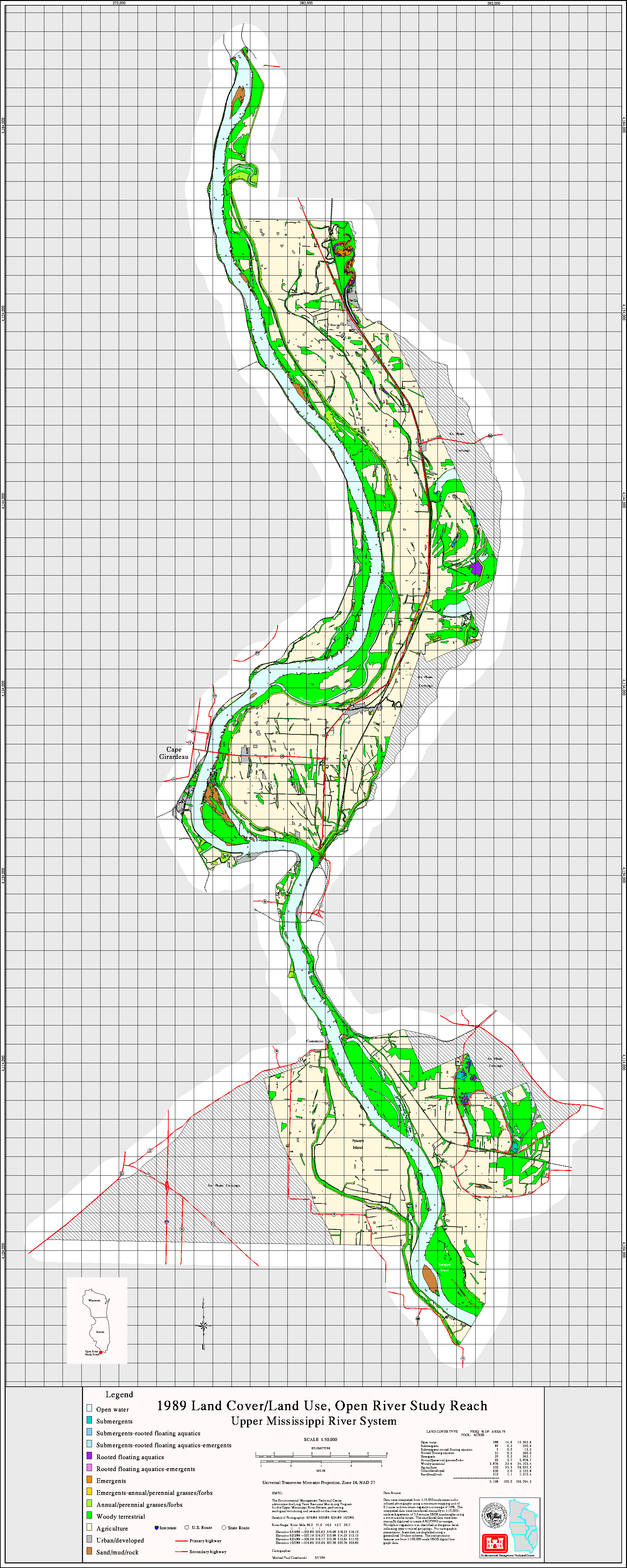 Since 1989 the Upper Midwest Environmental Center through its association with the Long Term Resource Monitoring Program has been creating land cover/use data sets for the Upper Mississippi River system. For background information on how these data sets were created and are attributed, activate the help buttons. A link to a freeware GIS data viewer that can read the Shape files is also available.