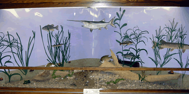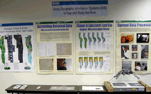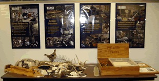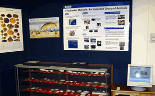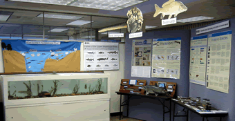 The entrance foyer of the west campus of the Upper Midwest Environmental Sciences Center (2630 Fanta Reed Rd., La Crosse) is open to the public Monday through Friday from 8:00 AM to 4:00 PM. A variety of displays have been made for use by visitors of all ages. These include information on invasive species (i.e. sea lampreys, round gobies, zebra mussels), migratory songbirds, native freshwater mussels and radiotelemetry methods used to track fish and wildlife for research. Live fish and native freshwater mussels from the Mississippi River can be viewed. A "hands on" table has bones, feathers, mussel shells, etc. and a "wildlife tracks" display to learn about animal tracks and the life history of mammals from the area. |